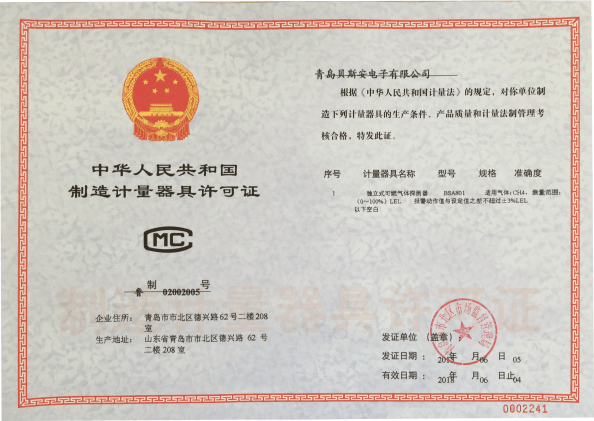 我公司是青島市具有國家質(zhì)量技術(shù)監(jiān)督部門頒發(fā)的計量器具生產(chǎn)許可證的生產(chǎn)企業(yè);獲得國家防爆電氣產(chǎn)品質(zhì)量監(jiān)督檢驗中心頒發(fā)的防爆合格證;獲得國家公安部消防產(chǎn)品合格評定中心頒發(fā)的消防產(chǎn)品形式認(rèn)可證書。
